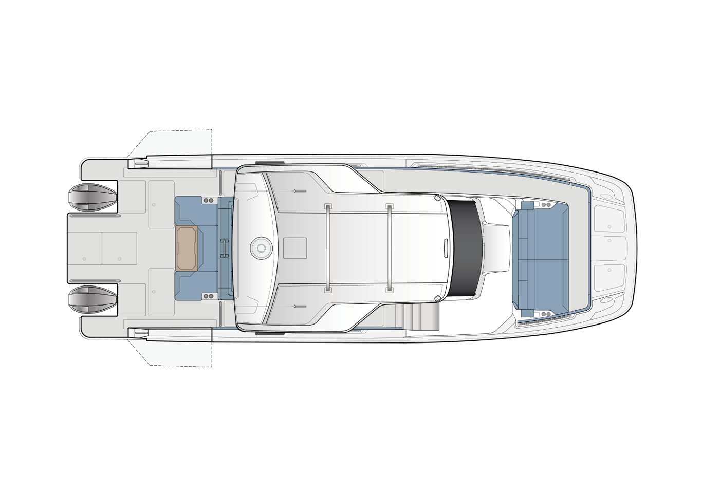Revolutionary livability thanks to the retractable side walls that extend the width to 5.8 meters, creating a unique seaside terrace for entertaining.